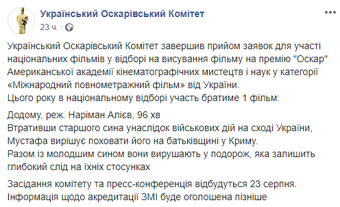 Об этом сообщает пресс-служба Украинского оскаровского комитета на своей странице в Facebook. В этом году в национальном отборе на участие в кинопремии "Оскар" представлен один фильм - картина "Домой", режиссером которой стал Нариман Алиев.