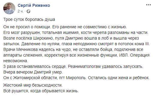 "Его ранение не совместимо с жизнью… Врачи Мечникова, надеясь на чудо, не оставляли бойца, подключив все аппараты слежения, корректируя все жизненные функции, аппарат ИВЛ. Операция невозможна. Три раза останавливалось сердце. реаниматолог удавалось запускать. Вчера вечером Дмитрий умер ", - написал главный врач Днепропетровской областной клинической больницы им.Мечникова Сергей Рыженко.