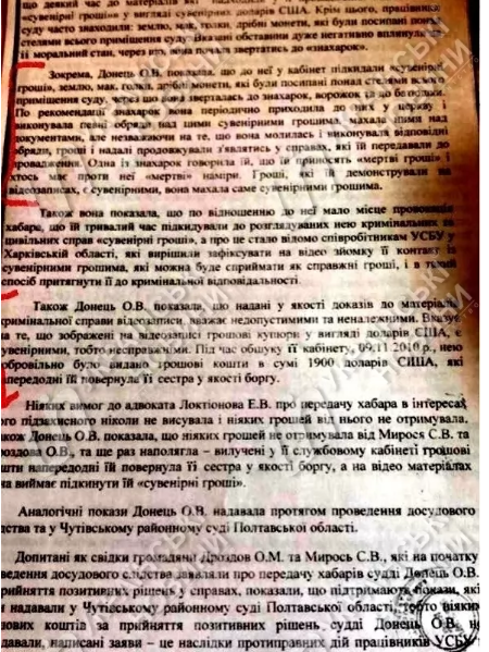 "Донец О.В. показала, что к ней в кабинет подкидывали "сувенирные деньги", землю, мак, иголки, мелкие монеты, которые были рассыпаны вдоль стен всего помещения суда. Из-за чего она обращалась к знахаркам, гадалкам и к батюшке. По рекомендации знахарок, она периодически приходила к ним в церковь и выполняла определенные обряды над этими сувенирными деньгами, махала ими над документами. Но несмотря на то, что она молилась и исполняла соответствующие обряды, деньги и дальше продолжали появляться в делах, которые ей передавали в производство. Одна из знахарок говорила ей, что ей приносят "мертвые деньги" и кто-то имеет против нее "мертвые" намерения. Деньги, которые ей демонстрировали на видеозаписях, являются сувенирными, она махала именно сувенирными деньгами", - говорится в постановлении о закрытии уголовного дела.