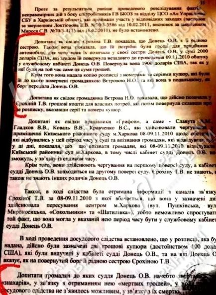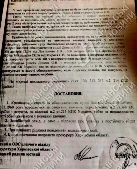 "Достаточные объективные данные, которые бы свидетельствовали, что Донец О.В. в своем служебном кабинете получала денежные средства в качестве взяток… не выявлены", - резюмирует закрывая дело следователь по особо важным делам Прокуратуры Харьковской области Владислав Якутин.