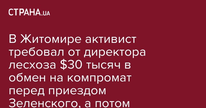 Активист угрожал распространить якобы компрометирующее видео о директоре лесхоза накануне визита президента Владимира Зеленского в Житомирскую область, если ему не выплатят 30 тысяч долларов. Об этом пишет пресс-служба СБУ.