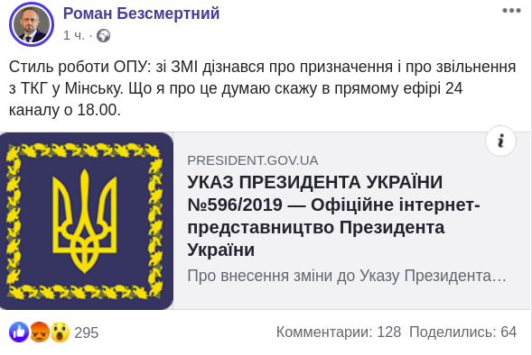 "Стиль работы ОПУ (Офис президента Украины - ИФ): из СМИ узнал о назначении и об увольнении из ТКГ в Минске", - написал он и прикрепил к посту соответствующий указ.