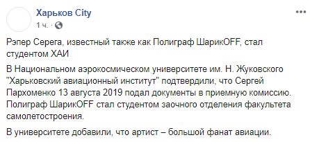 Сергей Пархоменко, более известный как рэпер Серега или Полиграф ШарикOFF, подал документы в приемную на поступление в Харьковский национальный аэрокосмический университет им. Жуковского.