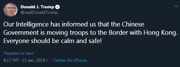 "Наша разведка проинформировала нас о том, что китайское правительство перебрасывает войска на границу с Гонконгом. Все должны быть спокойны и в безопасности!" - написал американский президент.
