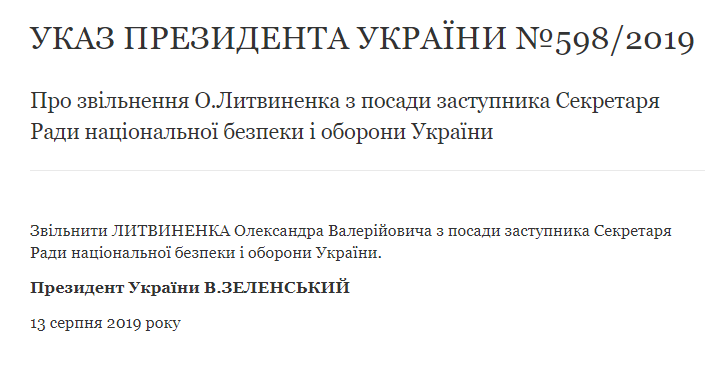"Уволить Литвиненко Александра Валерьевича с должности заместителя Секретаря Совета национальной безопасности и обороны Украины", - говорится в тексте указа.