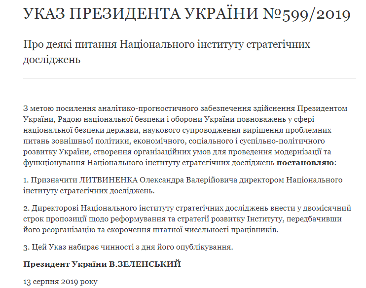 Следующим указом №599/2019 Зеленский назначил Литвиненко директором Национального института стратегических исследований. При этом он обязал уже нового директора в течение двух месяцев подготовить предложения по реформированию и стратегии развития института, который будет предусматривать реорганизацию и сокращение штата.