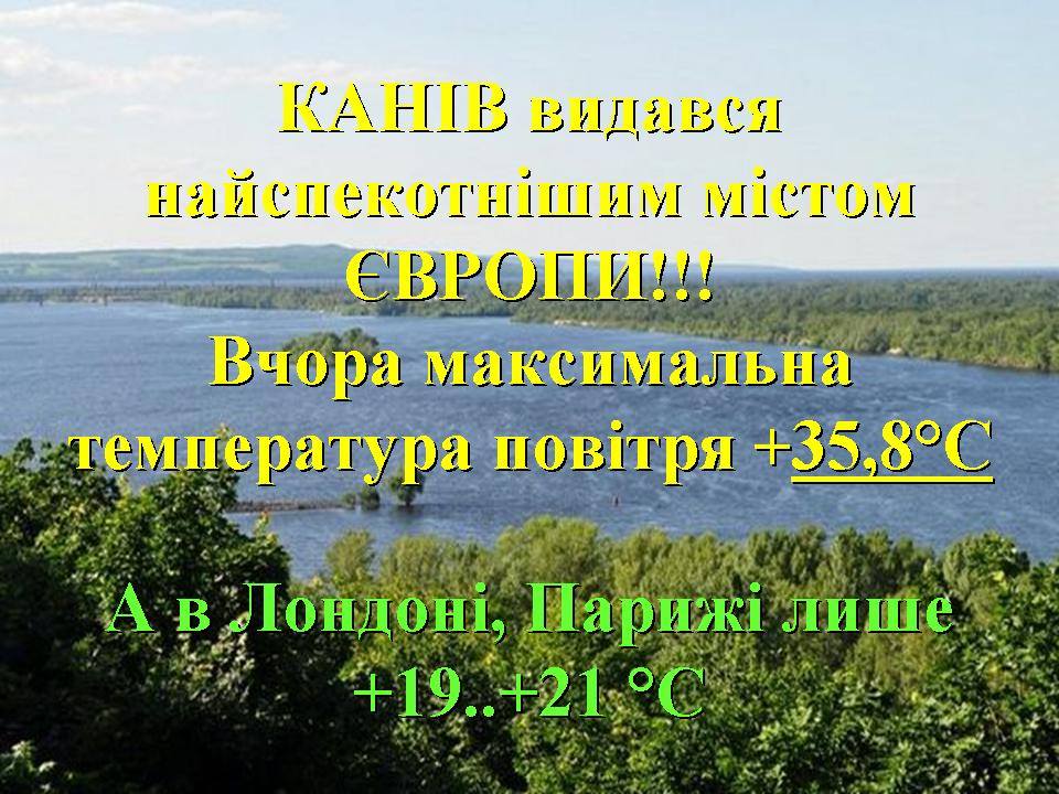 Во вторник, 14 августа, Канев Черкасской области оказался самым жарким городом в Европе. Здесь воздух прогрелся до +35,8 градусов по Цельсию. Об этом говорится на Facebook-странице начальника Черкасского областного центра по гидрометеорологии Виталия Постриганя.