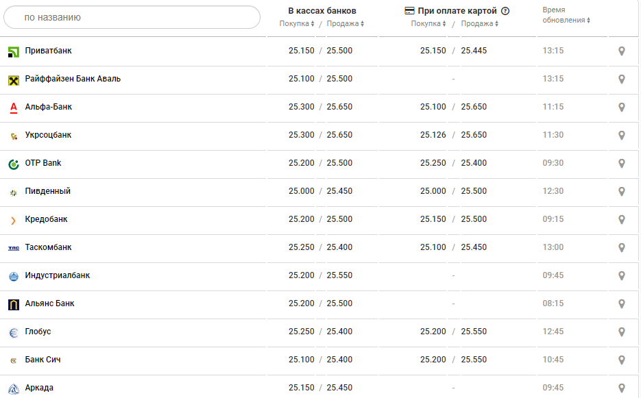 В банках курс доллара с утра был такой: покупка 25,150 грн, продажа 25,4 грн. В обед американская валюта немного подорожала: средняя покупка 25,2 грн, средняя продажа 25,5 грн.