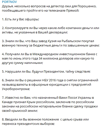 Кроме того, юрист предложил список вопросов, которые стоит задать экс-президенту во время прохождения полиграфа - пусть и на телеканале "Прямой".