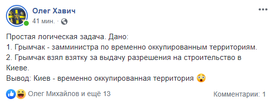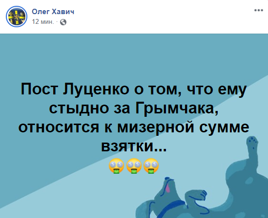 "Друзья, вашему вниманию тайна следствия из НАБУ. Члену команды Порошенко Грымчаку, как и природно для среднестатистического героя Майдана, инкриминируется взятка в 50 000 долларов США, которую он успешно разделил с соучастниками.