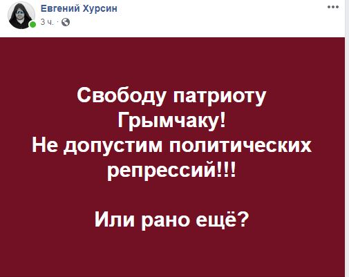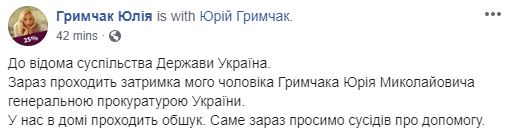 "К сведению общества государства Украина. Сейчас проходит задержка моего мужа Грымчака Юрия Николаевича генеральной прокуратурой Украины. У нас в доме проходит обыск. Именно сейчас просим соседей о помощи", - написала она.