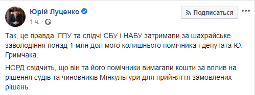 Генпрокурор дополнил свою публикацию и отметил в Facebook, что "Грымчак и его помощники требовали средства за влияние на решения судей и чиновников Минкультуры для принятия заказных решений".