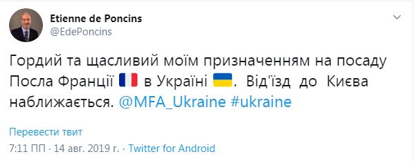 Недавно назначенный посол Франции в Украине Этьен де Понсен сообщил, что вскоре собирается прибыть в Киев. Об этом он написал в Twitter.