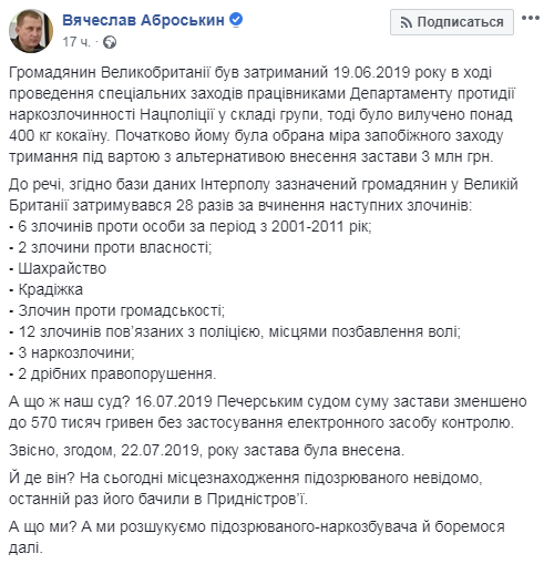 Скрылся гражданин Британии, задержанный в рамках уголовного производства о контрабанде 400 кг кокаина. Последний раз его видели на территории Приднестровья. Об этом говорится на Facebook-странице замначальника полиции Украины Вячеслава Аброськина.