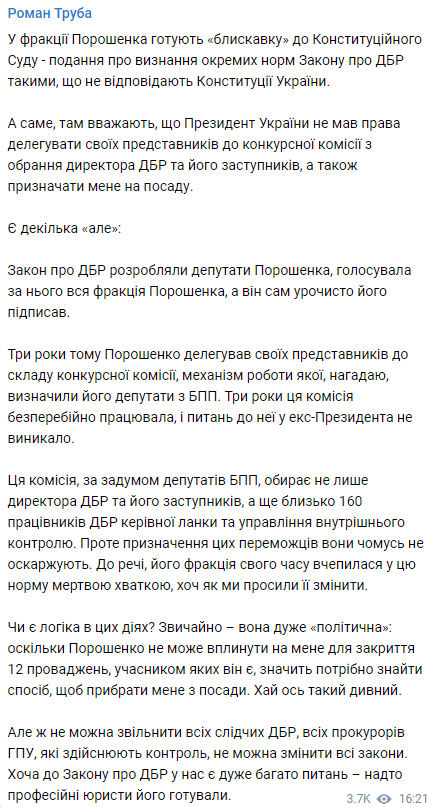 Глава Государственного бюро расследований Украины (ГБР) Роман Труба заявил, что партия "Европейская солидарность" Петра Порошенко готовит представление в Конституционный Суд Украины (КСУ) по поводу неконституционности отдельных норм закона о ГБР. Конечной целью представления является смещение с должности самого Романа Трубы.