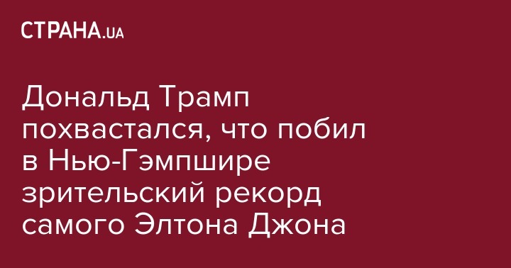 Президент США Дональд Трамп заявил, что его выступление перед избирателями в рамках президентской кампании 2020 года в штате Нью-Гэмпшир стало рекордным по числу зрителей, что позволило ему обогнать предыдущего рекордсмена, британского певца и композитора Элтона Джона.