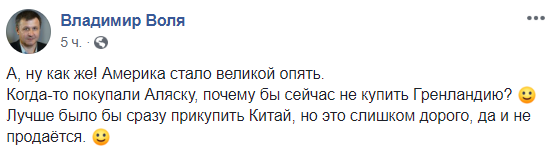 "Когда-то покупали Аляску, почему бы сейчас не купить Гренландию? Лучше было бы сразу прикупить Китай, но это слишком дорого, да и не продается", - иронизирует политолог Владимир Воля.