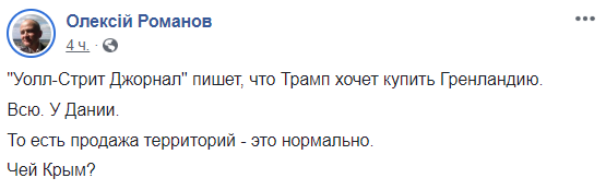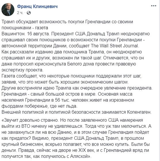 "Звучит довольно странно. Но после заявленного США намерения выйти из ВТО ничему не удивляешься. Тогда что уж там мелочиться. А не замахнуться ли на всю Данию, и в этом случае Гренландия пойдет как придаток? Видимо, президент США Дональд Трамп, в прошлом крупный бизнесмен, всерьез полагает, что все можно купить. Были бы деньги. Правда, сейчас на дворе не XIX век, и с Гренландией вряд ли получится так, как получилось с Аляской", - пишет в Facebook сенатор Франц Клинцевич.