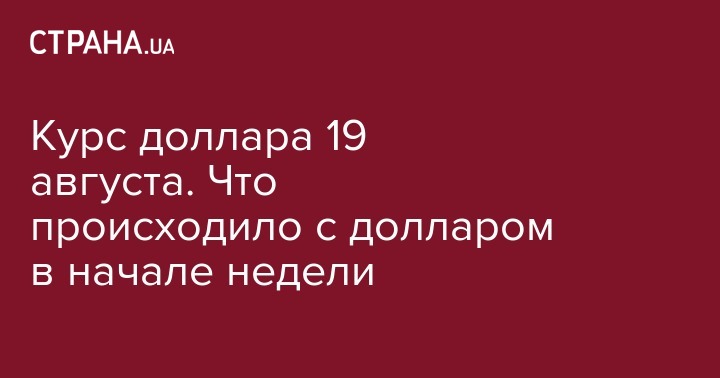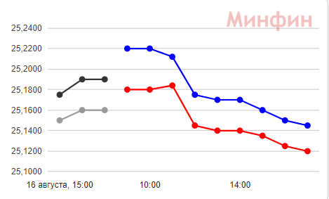 19 августа НБУ установил официальный курс доллара понизил курс доллара на 18 копеек - до 25,14 грн. В обменках доллар не менялся целый день: покупка в районе 25,24 грн, продажа - 25,28 грн. Межбанк закрылся с котировками 25,12 грн - покупка и 25,14 грн - продажа. В банках доллар в среднем покупали за 25,10 грн и продавали за 25,35 грн.