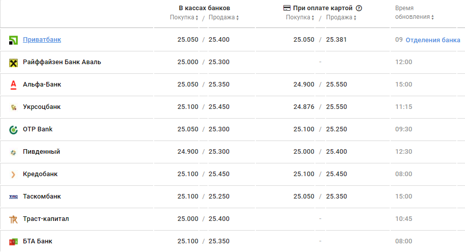 В банках курс доллара с утра был такой: средняя покупка 25,05 грн, средняя продажа 25,40 грн. В обед американская валюта ненамного подорожала: 25,10 грн - покупка и 25,40 грн - продажа. К вечеру средний курс составил 25,10 грн в покупке и 25,35 грн в продаже. В разных банках курс немного отличался в течение всего дня.