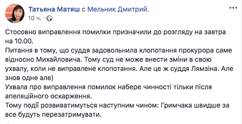 После оглашения определения суда об избрании меры пресечения Грымчаку в виде содержания под стражей с альтернативой залога в 6 млн грн, адвокат Татьяна Матяш обратила внимание на то, что решение не имеет законной силы, поскольку оно касается Юрия Михайловича Грымчака, а не Юрия Николаевича.