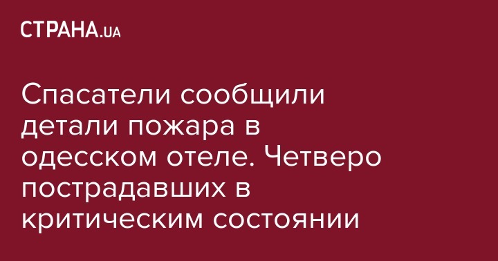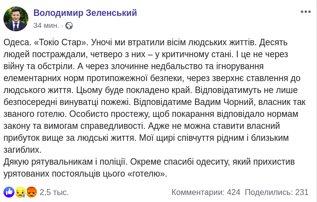 Кроме того,  президент Украины Владимир Зеленский сообщил, что четверо из пострадавших во время ночного пожара в гостинице "Токио Стар" в Одессе находятся в критическом состоянии. Об этом он написал на своей странице в Facebook и добавил, что лично проследит за тем, чтобы наказание виновным было полным.