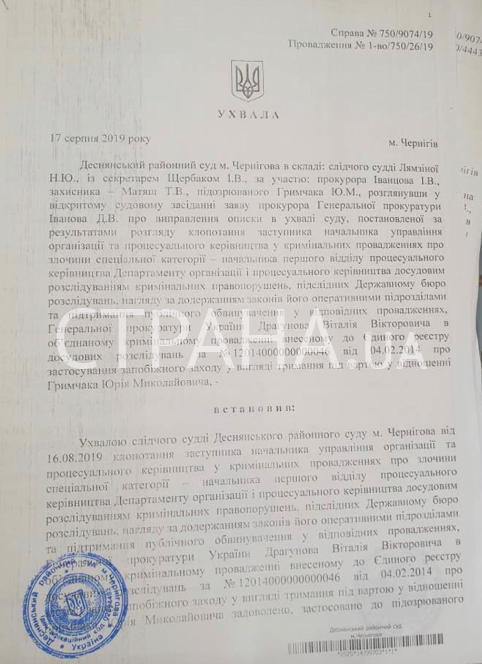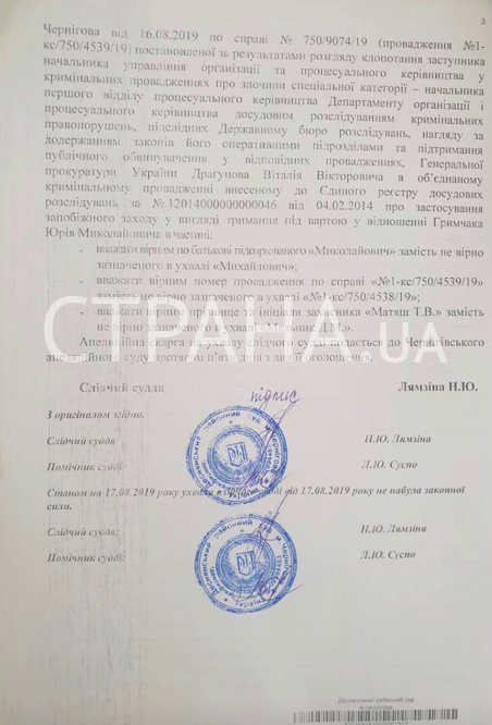 В субботу, 17 августа, Черниговский суд по собственной инициативе исправил свои ошибки в документах, подготовленных для задержания замминистра по вопросам оккупированных территорий Юрия Грымчака. Об этом сообщает корреспондент "Страны".
