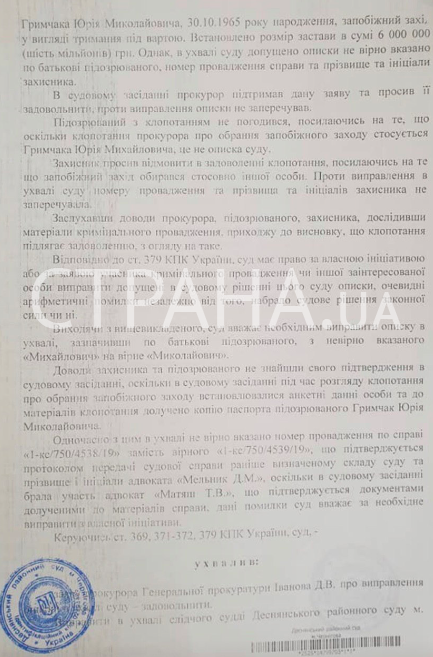 Суд исправил неправильный номер дела, фамилию и инициалы адвоката, а также отчество Грымчака (с неправильного "Михайлович" на верное "Николаевич").