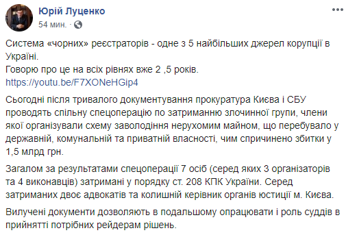 "Сегодня после длительного документирования прокуратура Киева и СБУ проводят совместную спецоперацию по задержанию преступной группы, члены которой организовали схему завладения недвижимым имуществом, которое находилось в государственной, коммунальной и частной собственности, чем нанесен ущерб в 1,5 млрд грн", - написал он.