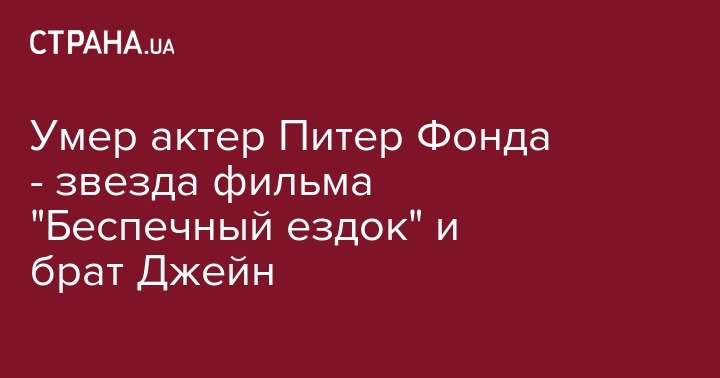Американский актер, сценарист и режиссер Питер Фонда, который сыграл в культовом фильме "Беспечный ездок" (Easy Rider), умер в пятницу утром 16 августа, в возрасте 79 лет, передает ВВС со ссылкой на представителей актера.