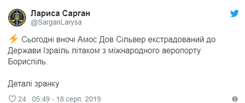 "Сегодня ночью Амос Дов Сильвер экстрадирован в Государство Израиль самолетом из международного аэропорта Борисполь", - написала она.