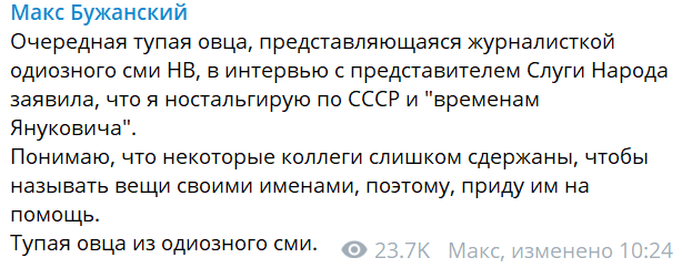 "Очередная тупая овца, представляющаяся журналисткой одиозного сми НВ, в интервью с представителем Слуги Народа заявила, что я ностальгирую по СССР и "временам Януковича".