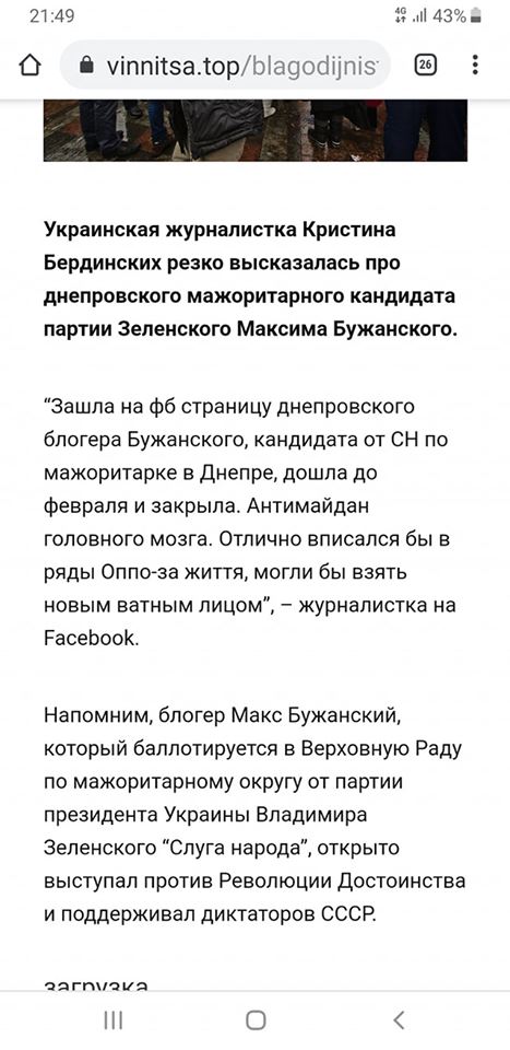 Отметим, что это не первая атака журналистов "НВ" на Бужанского. Так, недавно на своей странице в соцсети Кристина Бердинских заявила, что у кандидата от "Слуги народа" "антимайдан головного мозга" и назвала его "ватником".