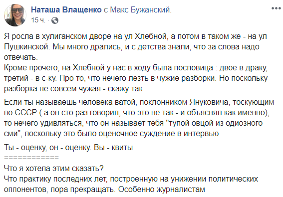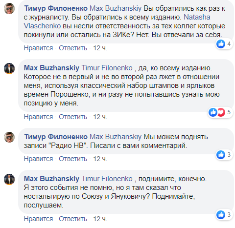 В комментариях у Влащенко Бужанский поспорил с журналистом "Радио НВ" Тимуром Филоненко. Тот высказал нардепу претензию, что он оскорбил все издание за слова отдельной журналистки.