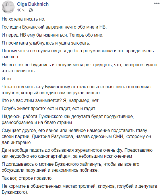 Так вот, старое правило. Не кормите в общественных местах троллей, клоунов, голубей и депутата Бужанского", - написала Духнич в соцсетях.