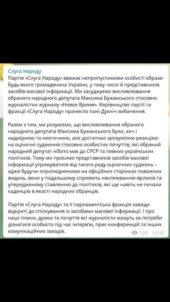 На телеграм-аккаунте политсилы заявили, что осуждают выражения, которые употребил Бужанский. И приносят Ольге Духнич извинения.