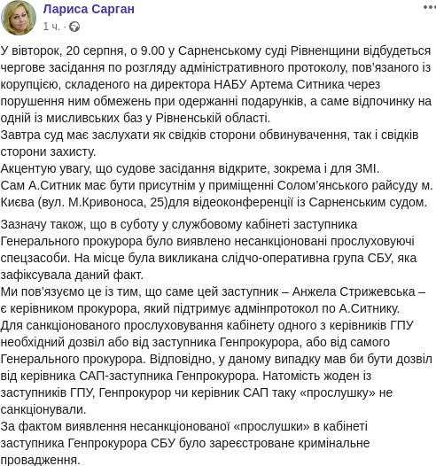 "В субботу в служебном кабинете заместителя генерального прокурора обнаружены несанкционированные прослушивающие спецсредства. На место была вызвана следственно-оперативная группа СБУ, которая зафиксировала данный факт. Мы связываем это с тем, что именно этот заместитель - Анжела Стрижевская - является руководителем прокурора, который поддерживает админпротокол по Сытнику", - написала Сарган.