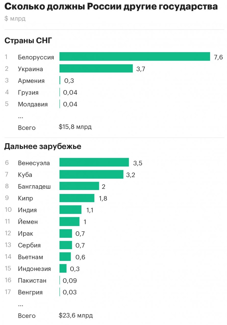 Отмечается, что Украина входит в список 17 крупных должников РФ, которые суммарно должны около $27 млрд. Самая большая задолженность у Белоруссий - $7,55 млрд. На третьем месте после Украины находится Венесуэла.