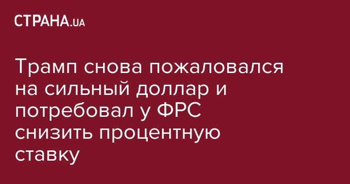Американский лидер Дональд Трамп снова пожаловался на слишком сильный курс доллара и заявил, что базовая процентная ставка Федеральной резервной системы (ФРС) должна быть снижена хотя бы на 1%. Об этом он написал в своем Твиттере.