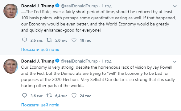 "Наш доллар так силен, что, к сожалению, это вредит другим странам. Ставка Федрезерва должна быть снижена как минимум на 100 базисных пунктов за довольно короткий период, возможно, в сочетании с некоторым количественным смягчением. Если это случится, наша экономика станет еще лучше, и мировая экономика получит быструю и большую помощь. Это хорошо для всех!".