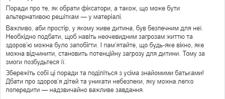 "Отец с сыном поднялись на девятый этаж в лифте и по лестнице пошли вниз. На восьмом этаже мужчина поставил мальчика на подоконник, чтобы он посмотрел в окно. Ребенок через незапертое окно наклонилась и выпал из окна. Мальчик умер. Это один из пяти случаев, произошедших в Киевской области только с начала лета", - пишет Супрун.