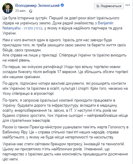 В-третьих, я пригласил израильские компании приходить работать в Украину: строить дороги и инфраструктуру, вкладывать в медицину, образование, энергосбережение и, конечно, в ИТ. В следующие пять лет мы будем стремительно расти, поэтому Украина сегодня – самое привлекательное место для стратегических инвесторов", - написал Зеленский.