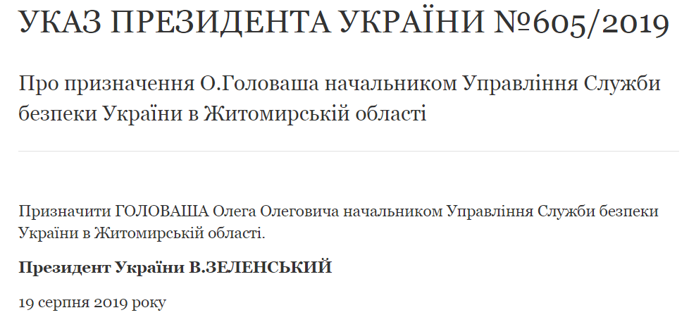 "Уволить Панасюка Виктора Степановича с должности начальника управления Службы безопасности Украины в Житомирской области. Назначить Головаша Олега Олеговича начальником Управления Службы безопасности Украины в Житомирской области", - говорится в документах.