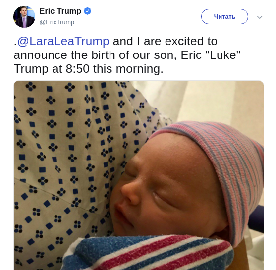 Президент США Дональд Трамп стал дедушкой в десятый раз. Жена его сына Эрика родила дочку. Новость сообщил во вторник сам Эрик Люк Трамп в своем Twitter.