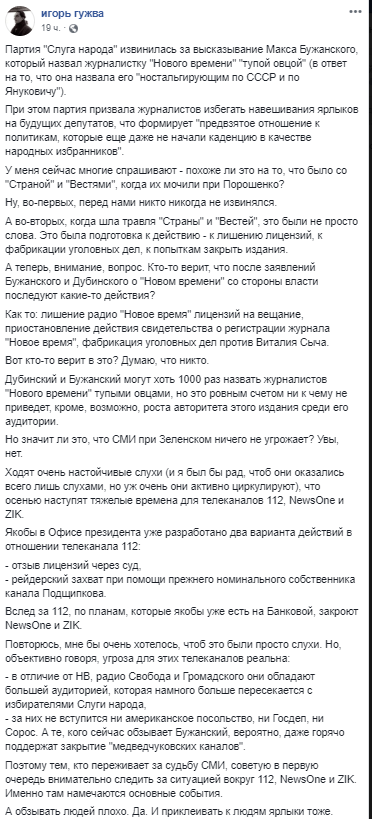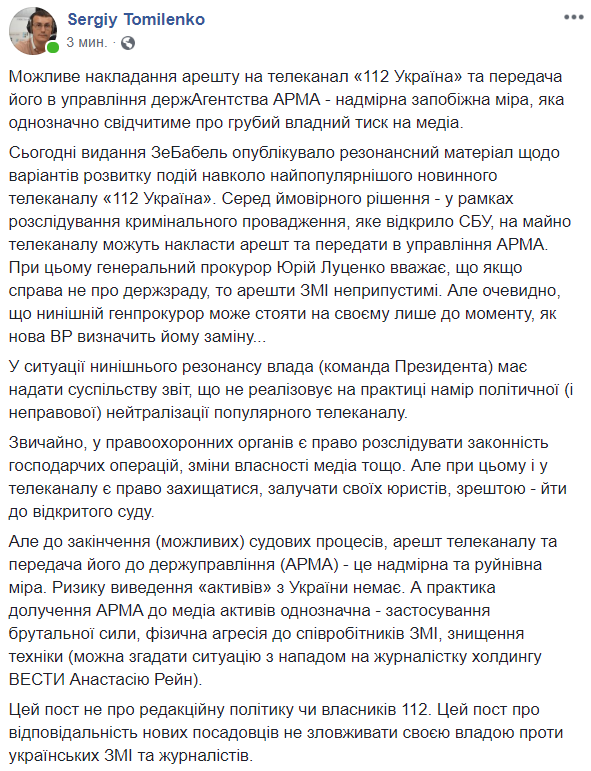 Этот пост не о редакционной политике или владельцах 112. Этот пост об ответственности новых чиновников не злоупотреблять своей властью против украинских СМИ и журналистов".