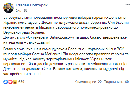 "По результатам проведения внеочередных выборов народных депутатов Украины, командующий Десантно-штурмовыми войсками Вооруженных сил Украины генерал-лейтенант Михаил Забродский прикомандирован в Верховную Раду Украины", - написал Полторак.