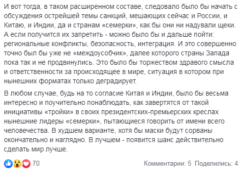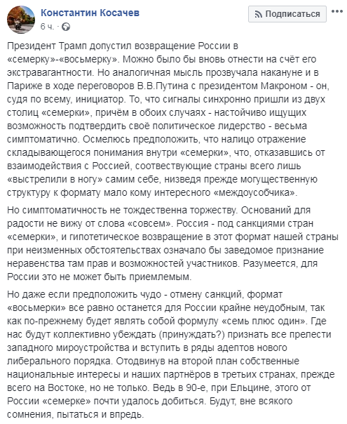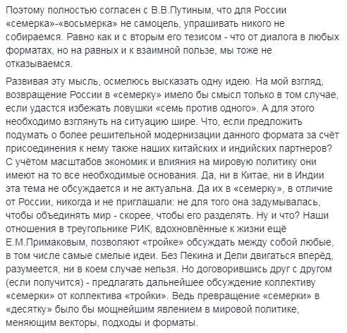 "На мой взгляд, возвращение России в "семерку" имело бы смысл только в том случае, если удастся избежать ловушки "семь против одного". А для этого необходимо взглянуть на ситуацию шире. Что, если предложить подумать о более решительной модернизации данного формата за счет присоединения к нему также наших китайских и индийских партнеров? С учетом масштабов экономик и влияния на мировую политику они имеют на то все необходимые основания. (...) Ведь превращение "семерки" в "десятку" было бы мощнейшим явлением в мировой политике, меняющим векторы, подходы и форматы" - говорится на фб-странице Косачева в среду, 21 августа.
