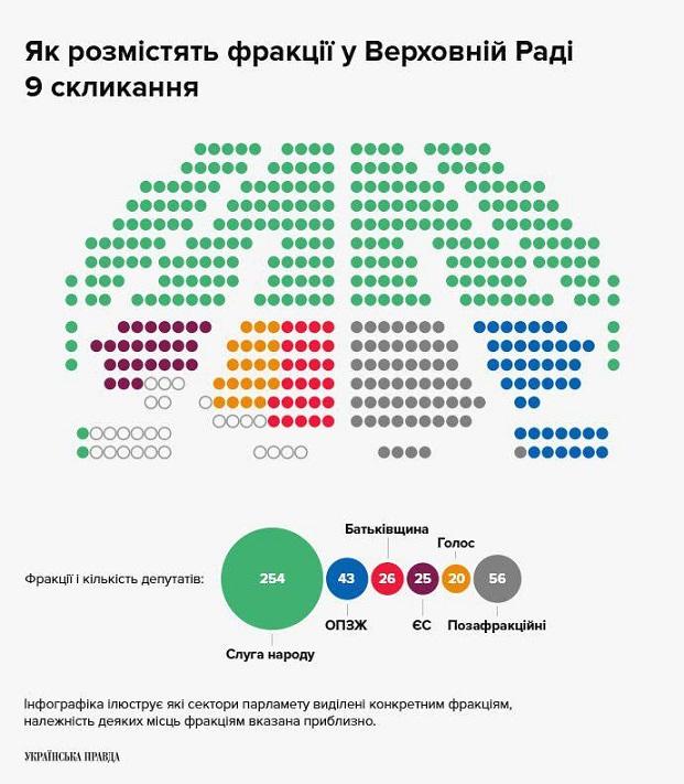 В правом крыле будут сидеть депутаты из партии экс-президента Петра Порошенко "Европейская солидарность" (25 мест). Посередине будут сидеть нардепы от "Голоса" (20 мест), "Батькивщины" (26 мест) и внефракционные депутаты (56 мест).