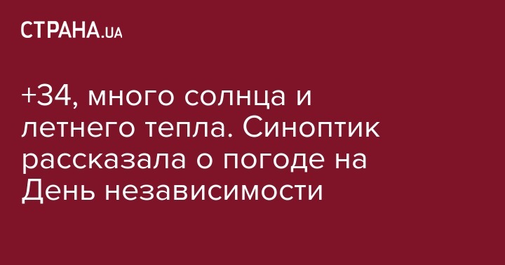 В субботу, 24 августа, когда вся страна будет отмечать День независимости, Украину ожидает солнечная и теплая погода. Об этом написала в Facebook синоптик Наталья Диденко.