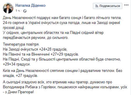 "День независимости подарит нам много солнца и много летнего тепла. 24 августа в Украине ожидается сухая погода, лишь на западе возможны отдельные грозовые дожди. В восточных, центральных областях и на юге восточный ветер будет порывистым, до сильного", - написала Наталья Диденко.